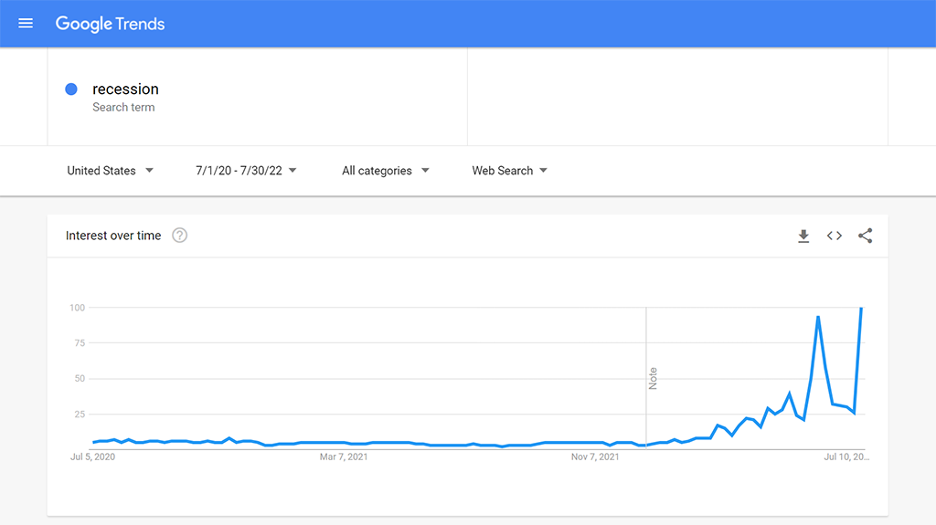 Les recherches sur Google pour le terme 'récession' ont atteint leur pic vers juin 2022 lorsque la Réserve fédérale des États-Unis a commencé à augmenter les taux d'intérêt de manière plus agressive :