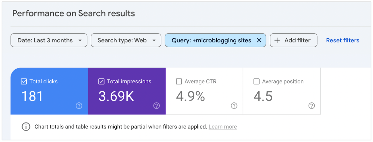 Par exemple, je souhaite découvrir le classement des mots-clés pour le mot-clé de base ‘sites de microblogging,’ donc je vais entrer ce mot-clé dans la boîte de requête et cliquer sur Appliquer. Maintenant, je peux voir tous les termes de recherche liés à mon mot-clé principal sur lesquels mon site est classé, ainsi que les impressions et les clics.