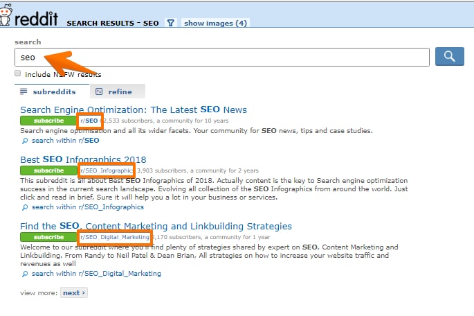 Un exemple de cela inclut le domaine du SEO, qui possède de nombreux subreddits associés tels que r/seo et r/seo_infographics.