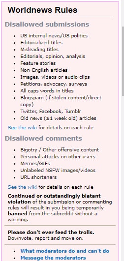 Chaque subreddit a ses propres règles et directives pour publier, alors assurez-vous de les lire attentivement avant de faire quoi que ce soit. Voici un exemple des règles chez r/worldnews.