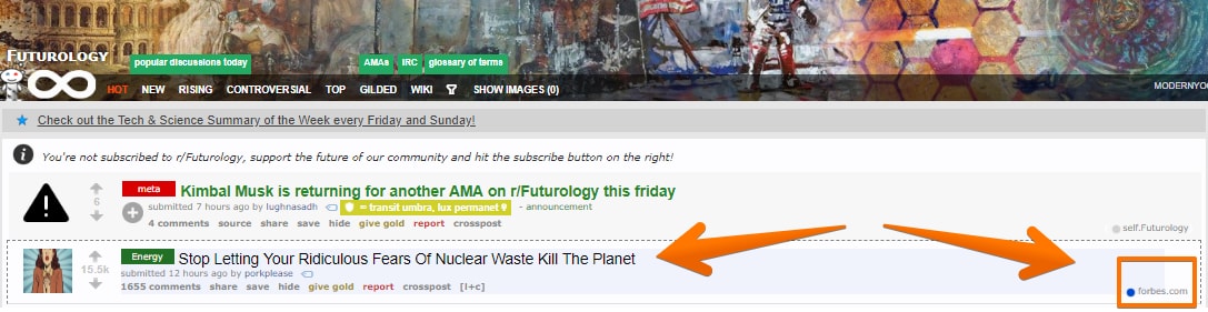 Remarquez-vous le logo Forbes à droite ? Lorsqu'un utilisateur clique sur ce lien, il sera redirigé vers l'article publié sur le site web de Forbes. Pour voir la discussion à propos de cet article sur Reddit, vous devrez cliquer sur les commentaires.