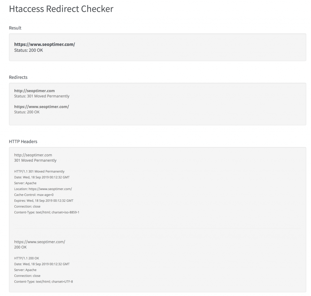 Vous pouvez utiliser un outil comme le Htaccess Redirect Checker, de SEOptimer, pour contrôler la redirection de votre URL. Il vous faut alors entrer les 8 versions indiquées ci-dessus pour obtenir une ventilation détaillée de l'URL vers laquelle chacune d'entre elles se redirige (avec le code d'état, le schéma, l'hôte, le chemin, le message d'état, les en-têtes de réponse, et le nombre de redirections).
