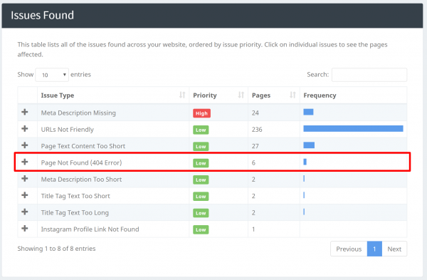 Vous pouvez identifier les problèmes de « 404 Error » sur notre page « Issues found » juste en dessous de la section « Page found »: