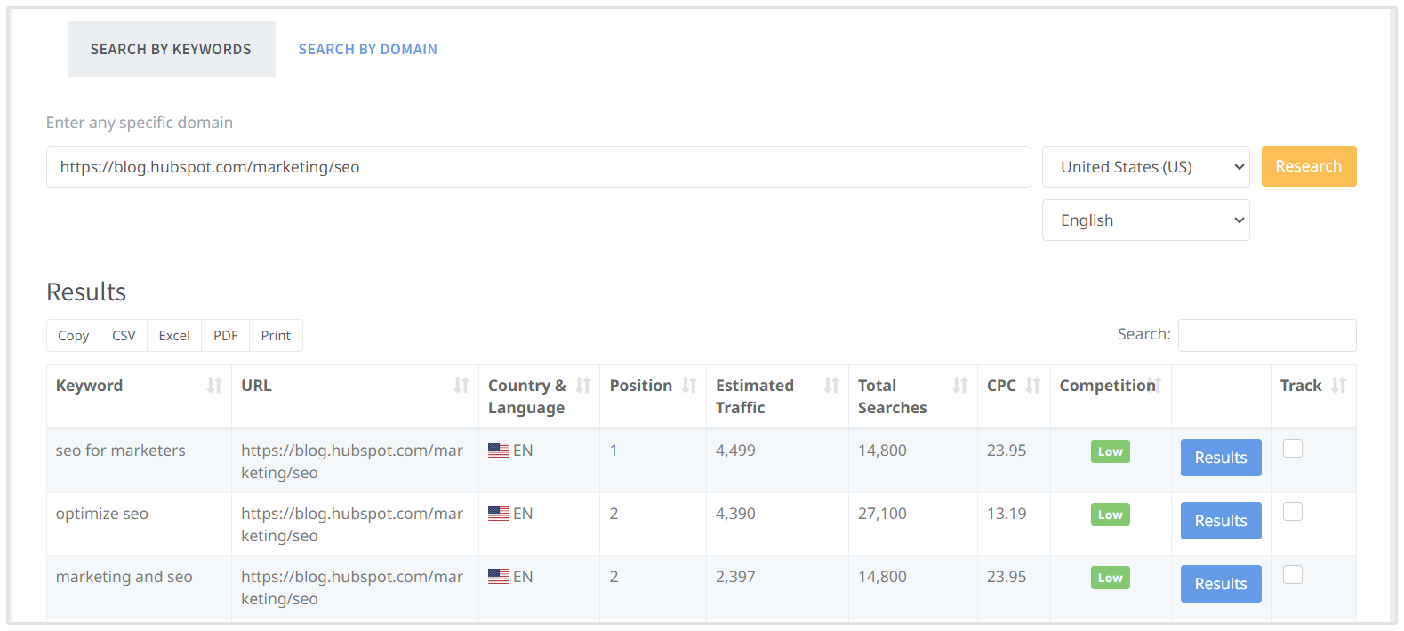 2. Insérez ces URL dans SEOptimer. Rendez-vous sur l'onglet Recherche de mots-clés, sélectionnez Recherche par domaine, puis saisissez l'URL. En règle générale, concentrez-vous sur les recherches avec un volume de recherche mensuel d'au moins 500 à 1 000.