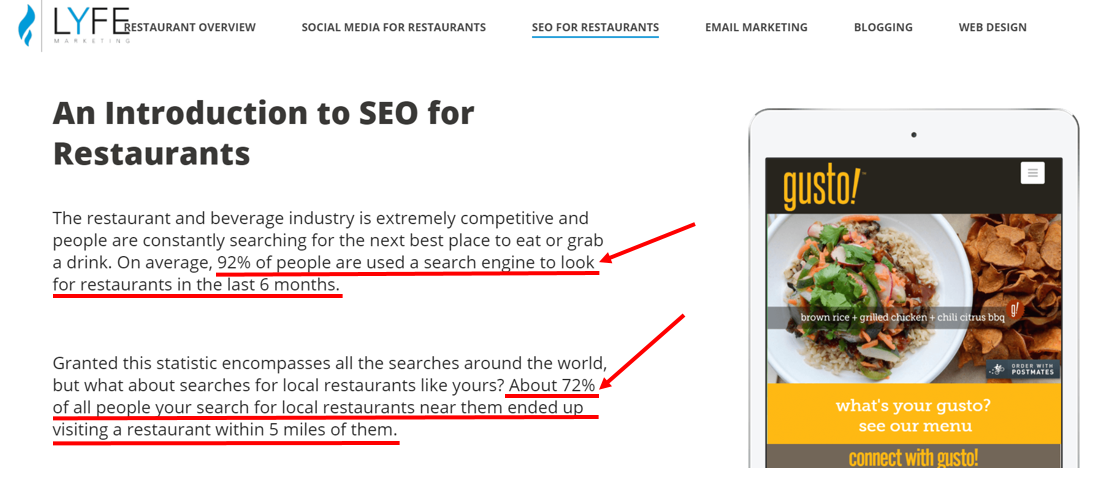 Di atas itu, mereka juga merujuk pada statistik khusus restoran, yang membuat konten dan penawaran mereka sangat relevan dengan audiens target. Agensi ini terdengar seperti mereka benar-benar "mengerti". Ini sangat berpengaruh karena setiap pemilik bisnis berpikir bahwa industrinya unik, jadi menjadi spesifik industri langsung menempatkan Anda sebagai seorang ahli.