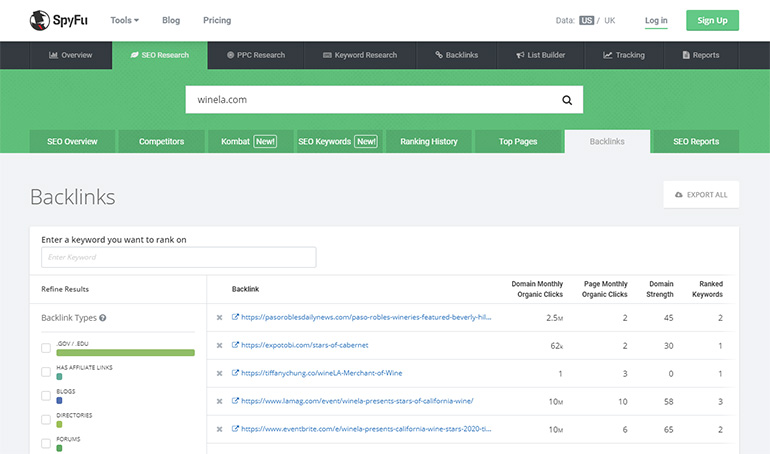 Alat Backlinks SpyFu mencantumkan semua situs web yang menautkan ke situs Anda. Ini berguna untuk mengurutkan backlink paling berharga Anda.