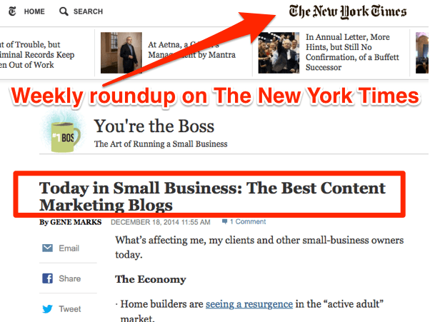 Dengan menggunakan metode ini, Anda bahkan bisa mendapatkan tautan dari situs web yang sangat berwibawa. Berikut ini adalah contoh dari rangkuman mingguan yang dijalankan oleh Gene Marks, dari The New York Times.