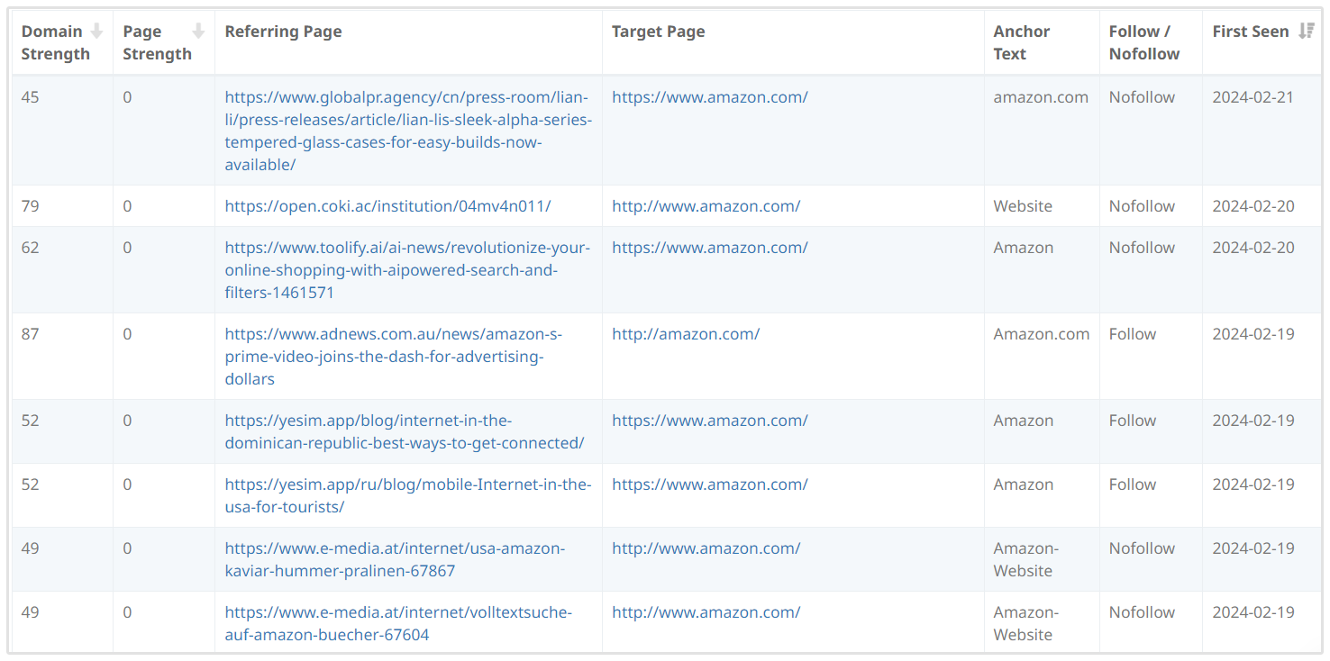 Anda kemudian dapat mengurutkan tautan berdasarkan Kekuatan Domain atau Kekuatan Halaman untuk menemukan backlink terbaik yang dapat dikejar untuk profil Anda.