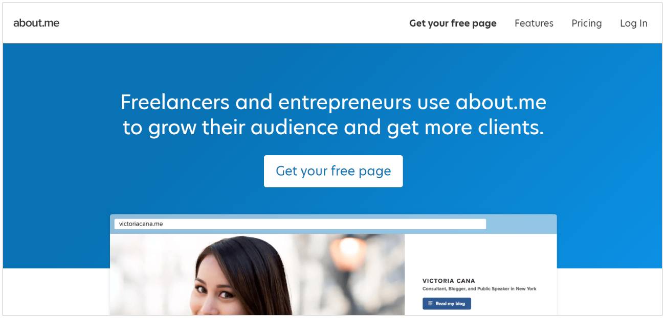 Sebagai contoh, mari kita pilih About.me sebuah situs pembuatan profil untuk freelancer.