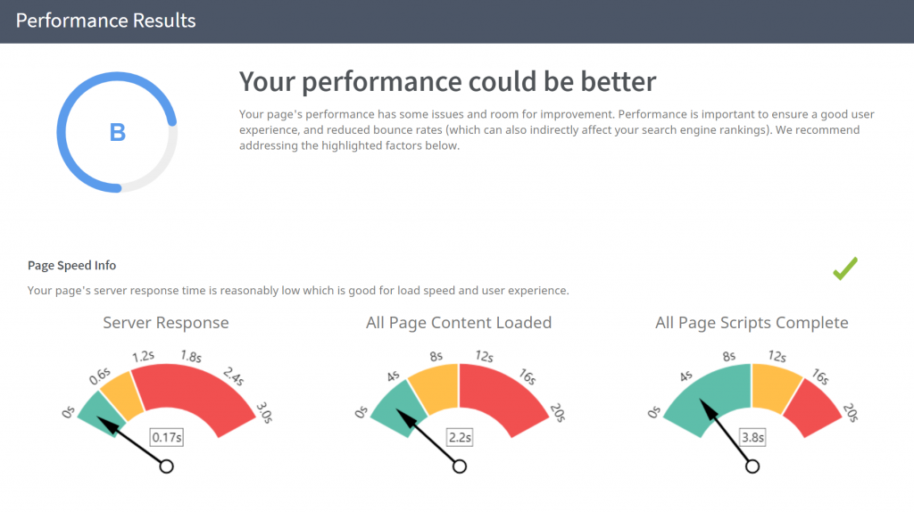 - Kecepatan muat halaman (berapa lama waktu yang dibutuhkan untuk situs Anda terload). Sebuah alat pengujian performa akan berguna di sini.