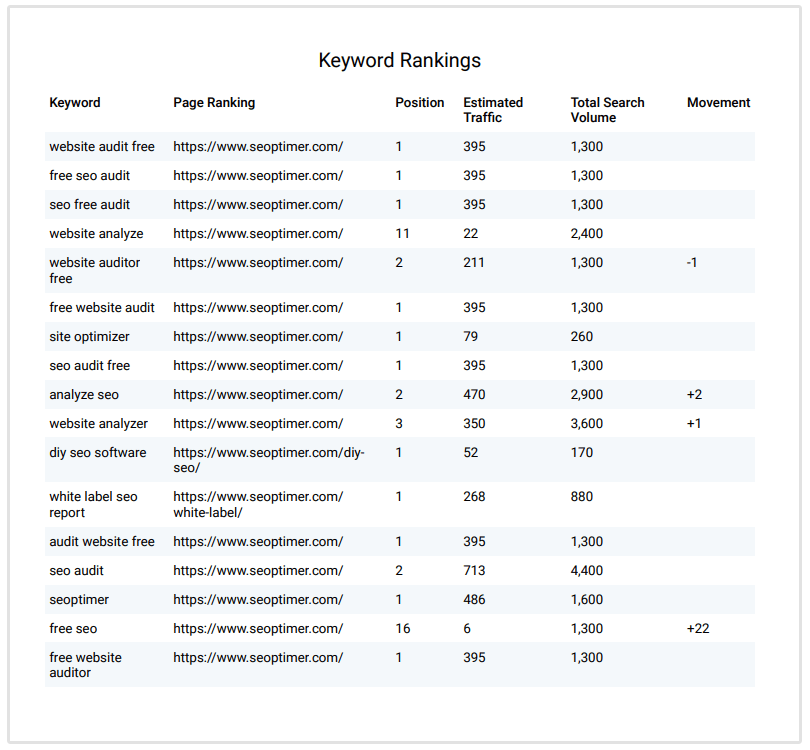 SEOptimer aggiorna le informazioni di classifica ogni sette giorni, fornendoti un'istantanea di dove si posizionano attualmente ciascuna delle tue parole chiave su Google.