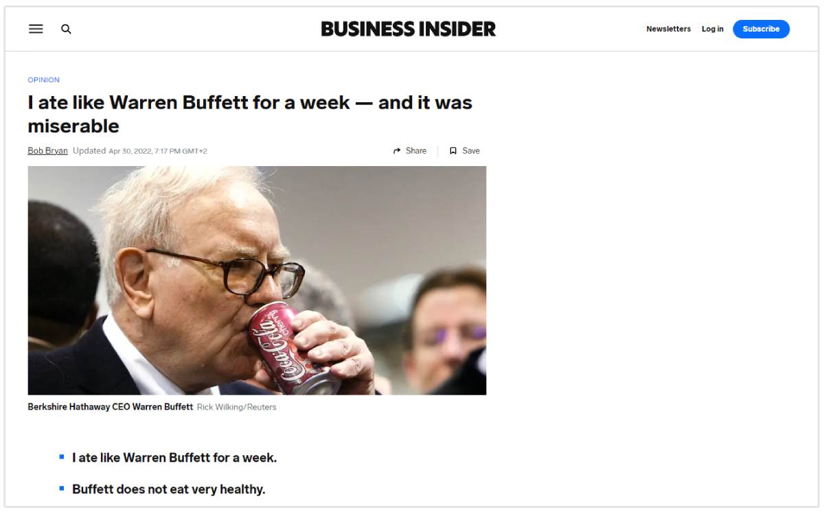 Uno dei miei esempi preferiti di tutti i tempi proviene da Business Insider, dove un membro dello staff ha mangiato come Warren Buffet per una settimana e ha descritto cosa è successo.