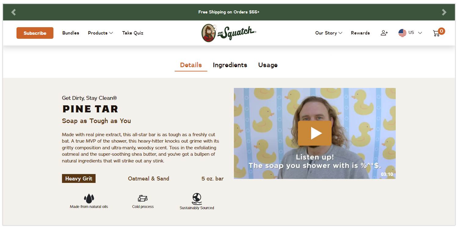 Concentrati sulla creazione di contenuti informativi e coinvolgenti che parlino direttamente al tuo cliente ideale. Un buon esempio di un marchio che ha fatto centro in questo è Dr. Squatch, un negozio eCommerce che vende saponi naturali per uomini.