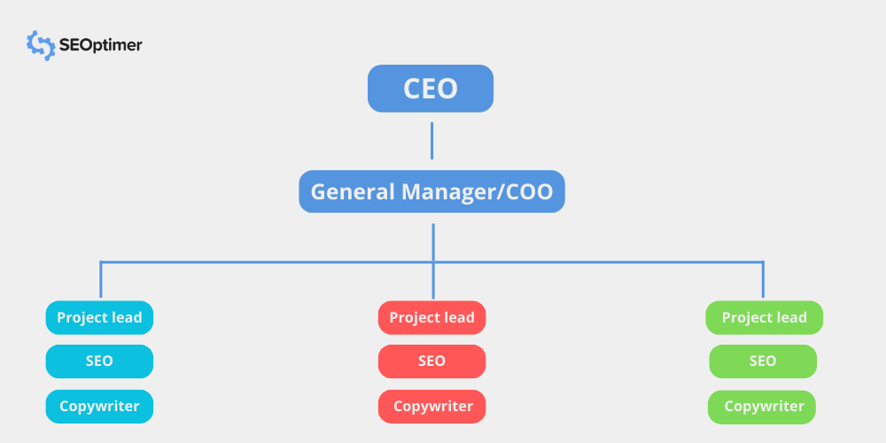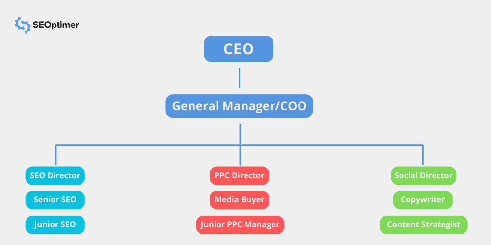 Ogni squadra, o divisione, è gestita da un responsabile di dipartimento (ad esempio, direttore del SEO) che riporta al direttore generale o a un altro esecutivo come un Chief Operating Officer (COO).