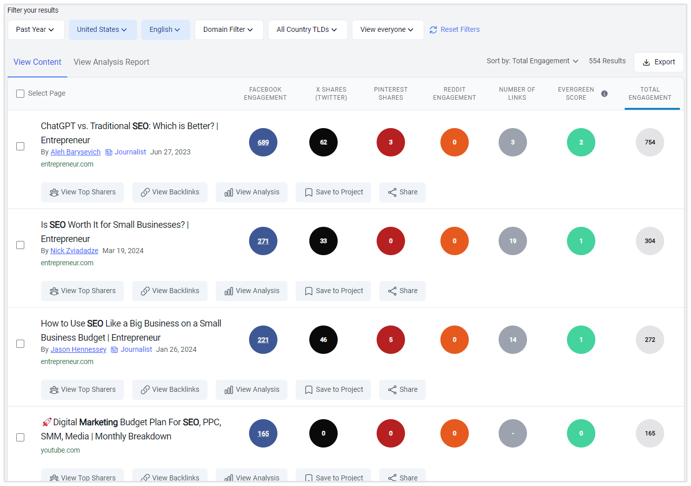 Dopo aver selezionato le parole chiave per la Tecnica del Grattacielo, cercherai quelle su BuzzSumo per vedere cosa c'è in termini di concorrenza.