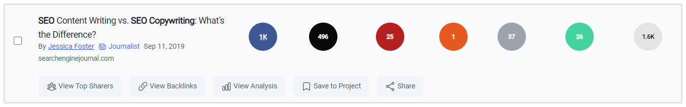 Quindi, lo strumento scelto elencherà tutti i nomi di dominio unici che rimandano all'articolo del tuo concorrente. Qui sotto, vedrai i risultati che ho ottenuto da BuzzSumo:
