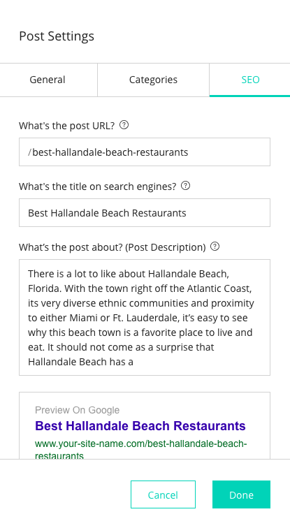 Aggiungi la tua meta descrizione dove dice “Di cosa tratta il post? (Descrizione del Post)”. Clicca su Fatto.
