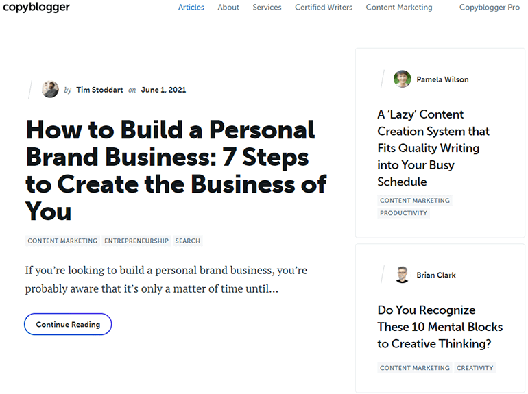 コンテンツライターにとって必読のブログであるCopybloggerは、まるでマーケティングのプロとコーヒーを飲みながらおしゃべりしているような感覚になるブログマーケティングエージェンシーの創作物です。Copybloggersの熟練したライターチームによって執筆されており、ブログはコンテンツライティングのニッチに特化しています。先延ばしと戦う方法や新しいアイデアを生み出すヒントなど、手早いアドバイスやアイデアを提供するCopybloggerは、しばらく執筆活動をしていて新しいインスピレーションを求めているライターにとって良い場所です。