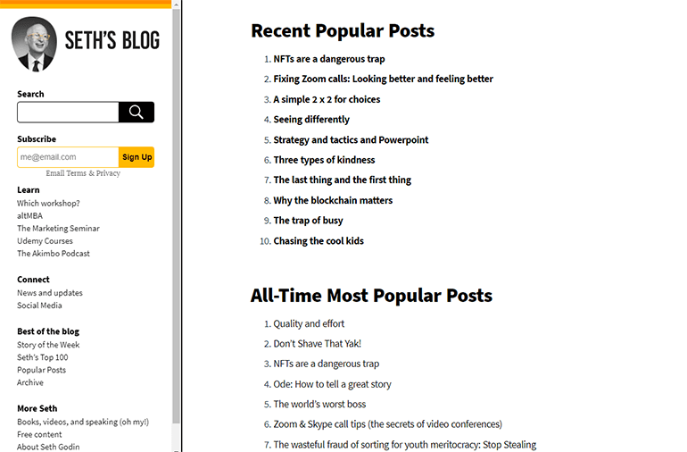ことわざにもあるように:今度はまったく違うことを。Seth Godinはビジネスリーダーの間で人気のある声であり、いくつかのビジネストレーニングプログラムを立ち上げているので、彼のアプローチは詳細なSEOよりも、年長の政治家からの思索の方が多いです。