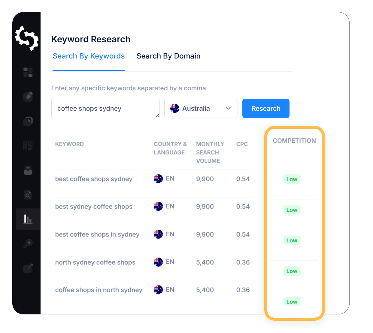 ロングテールキーワードの機会を見つけ、競合他社のキーワードを評価し、ランク付けが容易でありながらも強力なトラフィックポテンシャルを持つフレーズを優先することができます。