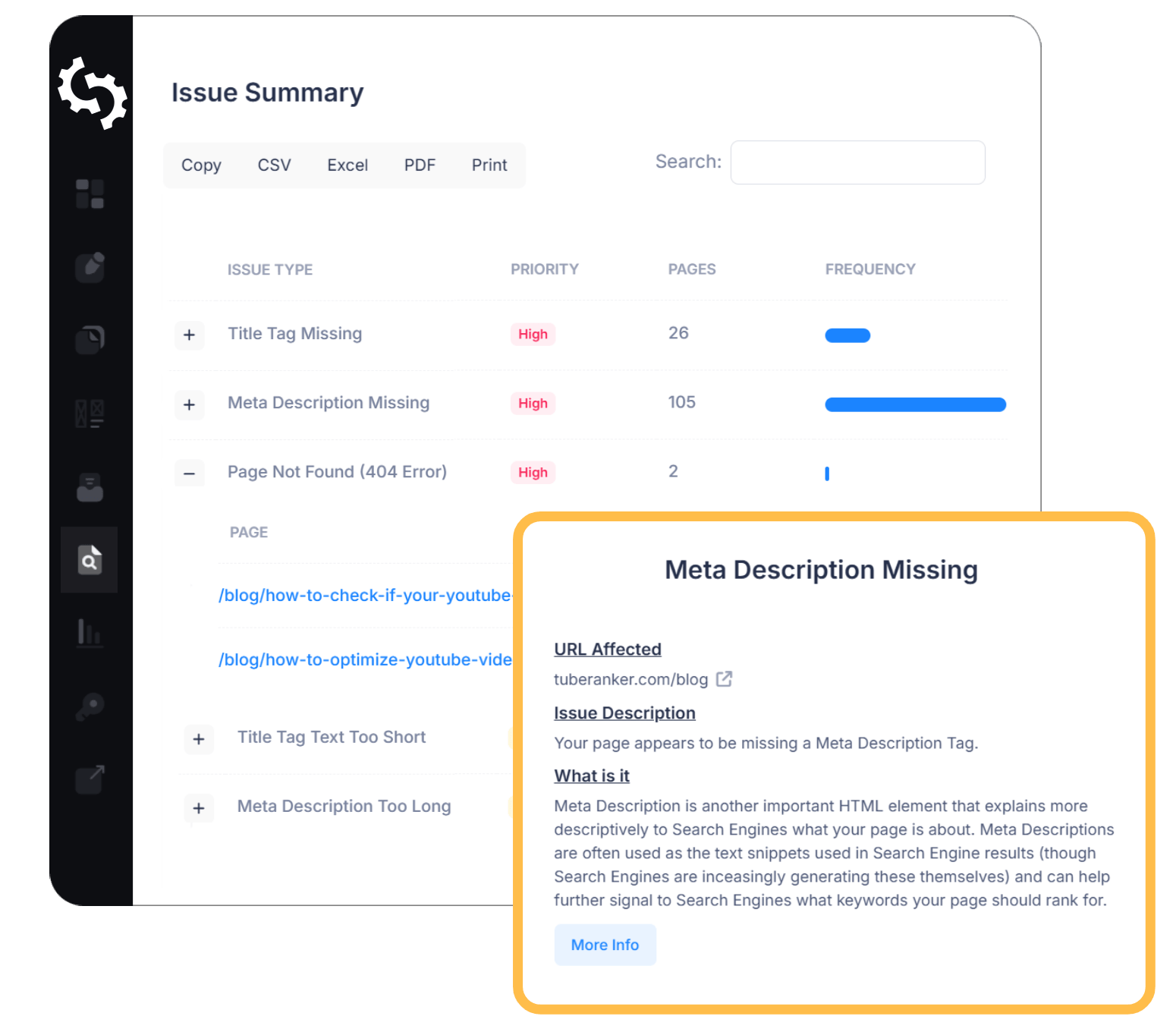 リンク切れやメタタグの欠如からリダイレクトチェーン、重複ページ、クロール深度の問題まで、当社のクローラーは深く掘り下げて存在さえ知らなかった問題を明らかにします。
