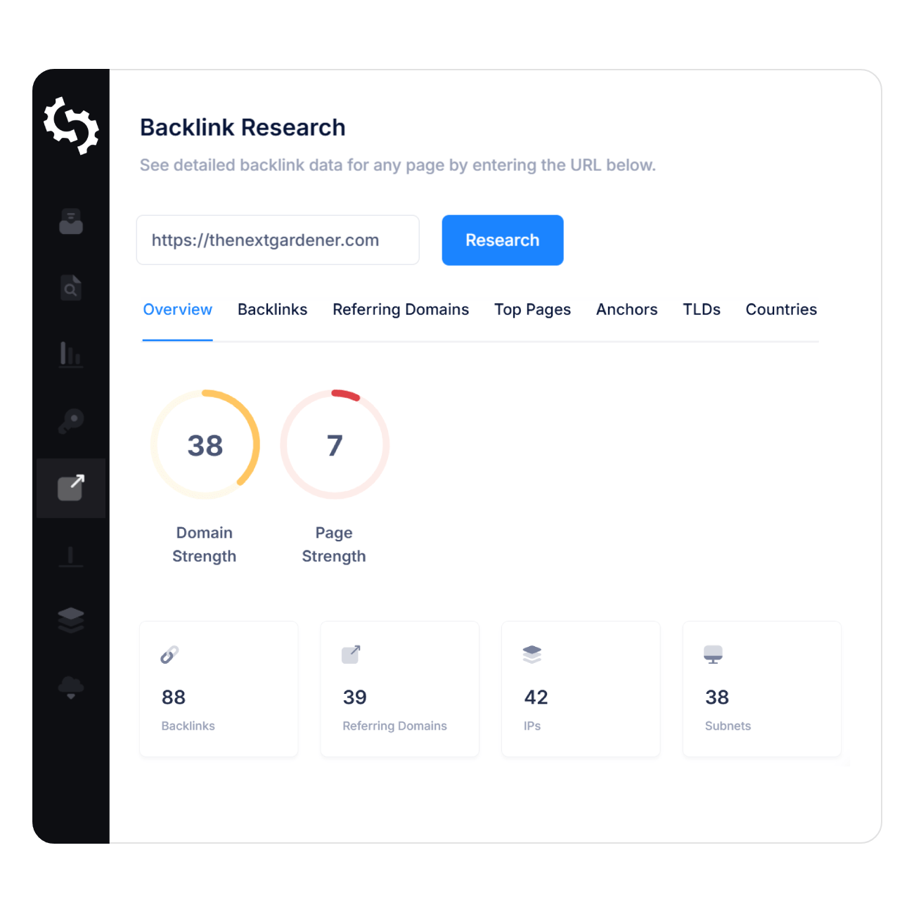すべてのSEOptimerユーザーは、バックリンクリサーチツールへの完全アクセスを得られます。次のようなバックリンクメトリクスを表示します: