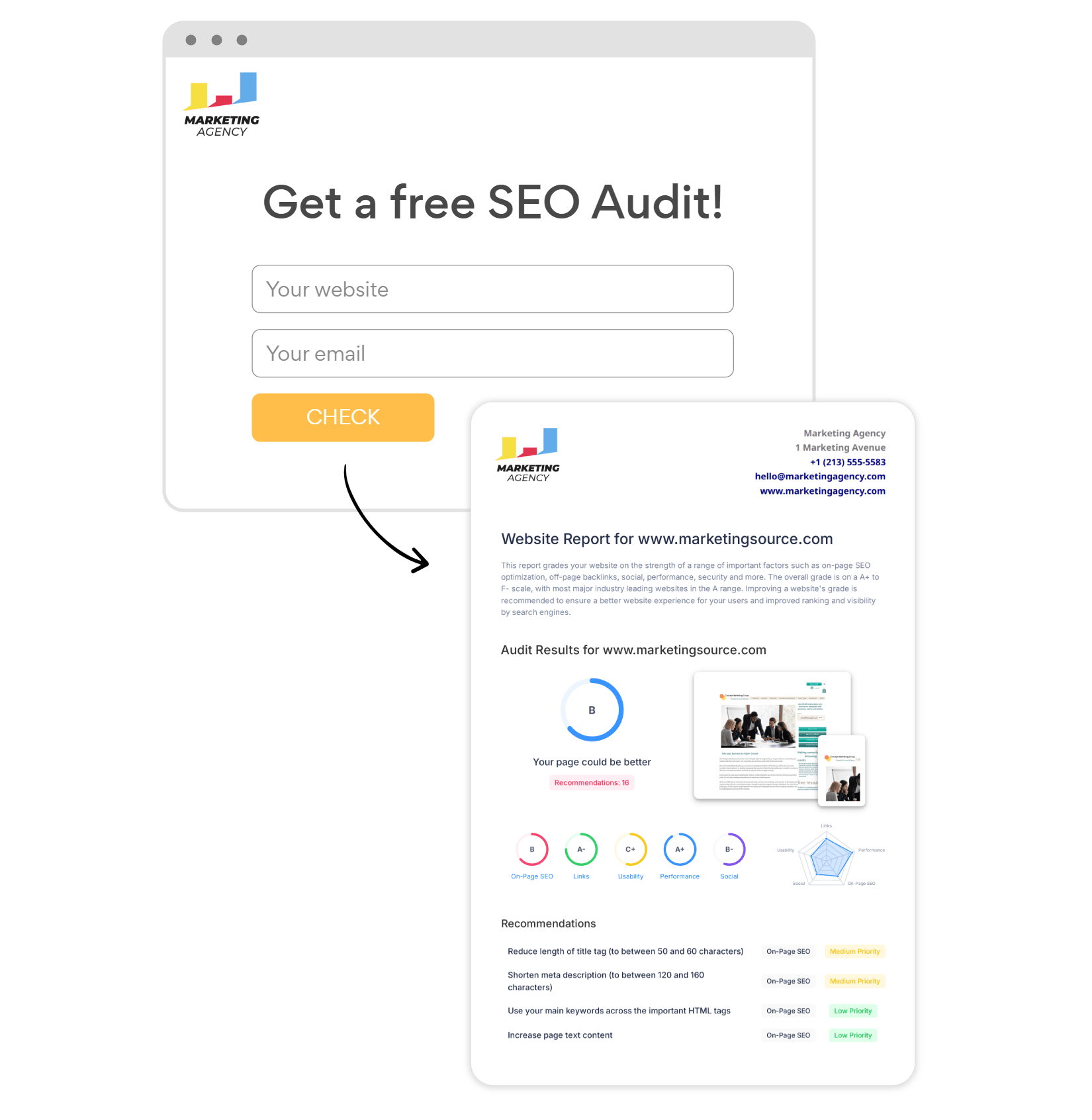 各監査は即座に価値を提供しながら、自動的に連絡先情報を取得し、ウェブサイトトラフィックを有資格リードに変換するのを助けます。