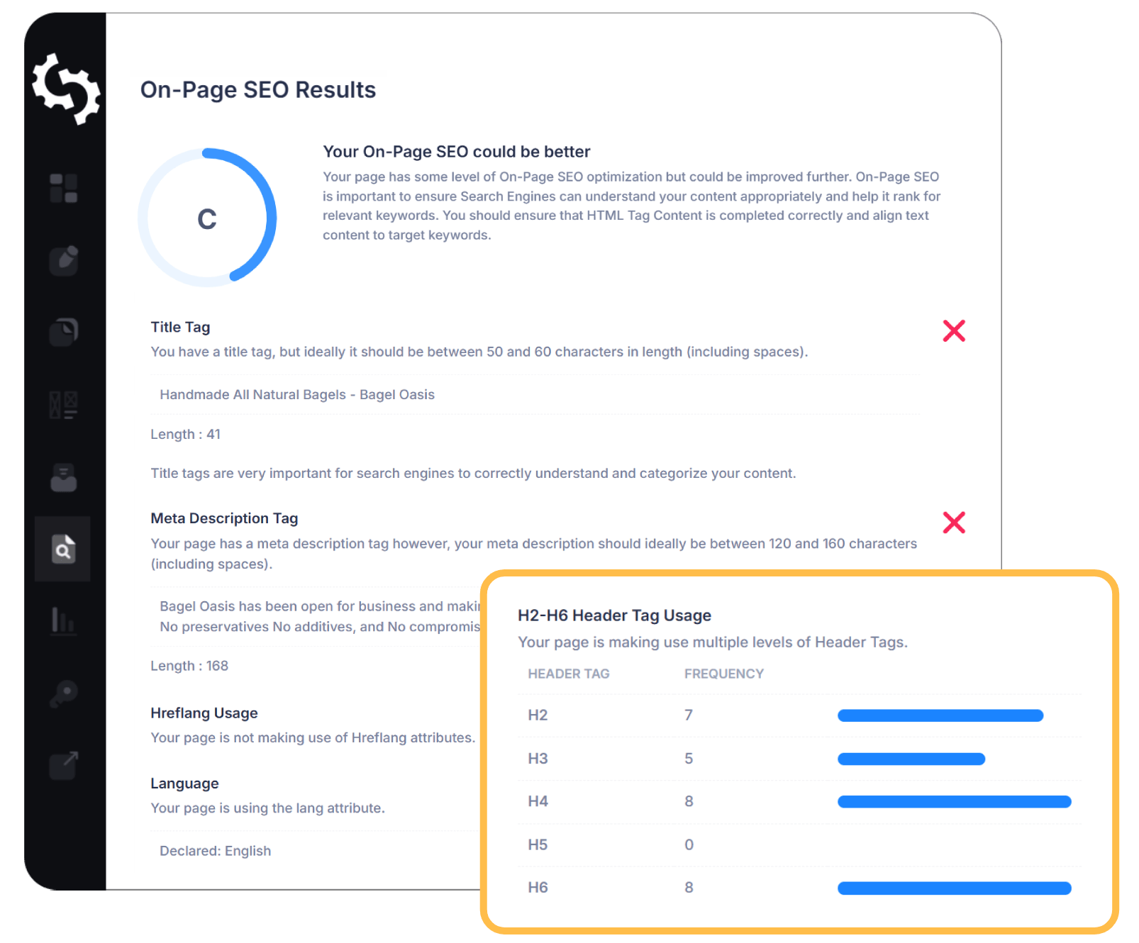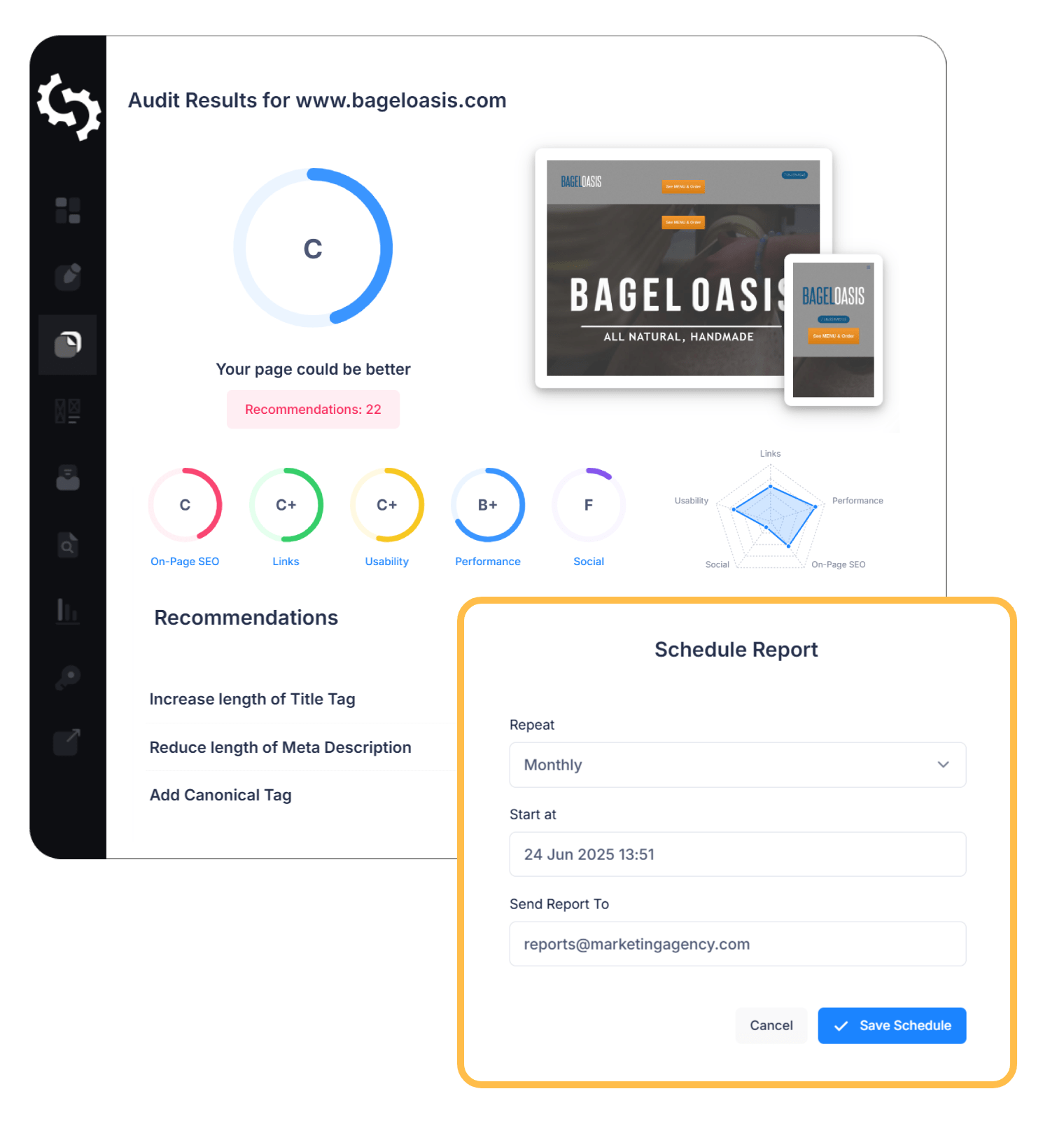 SEOptimerのSEO監査ツールは、オンページSEO、パフォーマンス、モバイル使用性、バックリンクプロファイルなど、100以上の重要なチェックを実行します。