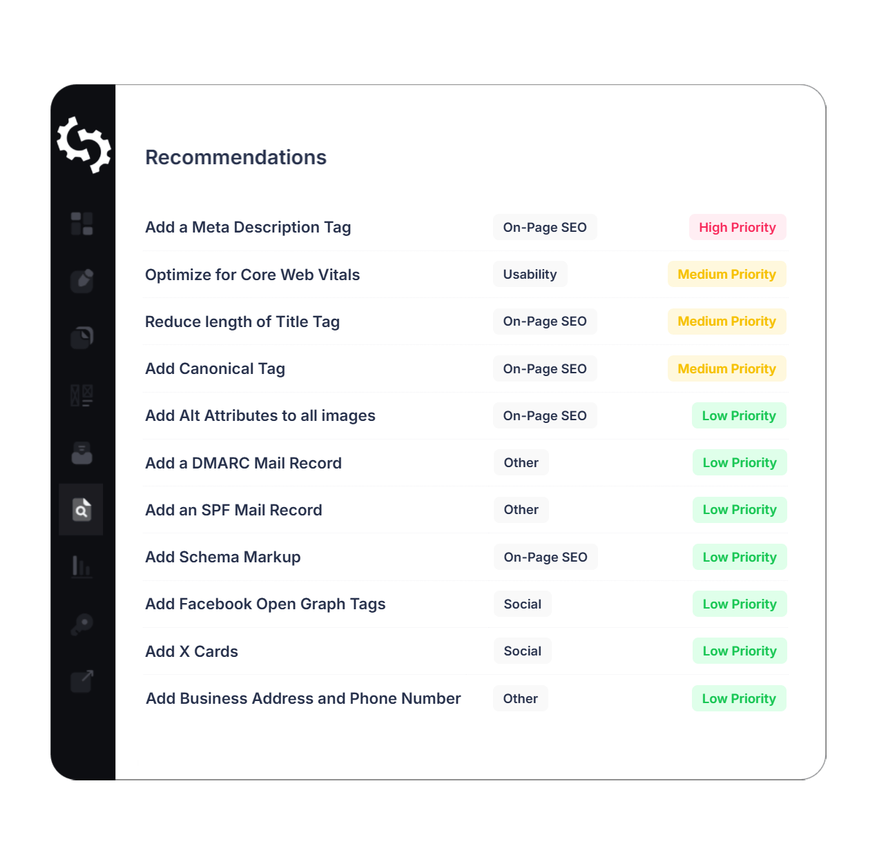 各監査は、優先順位付けされた問題と実行可能な推奨事項のリストを生成し、ユーザーが最初に修正すべき点を簡単に確認できるようにします。