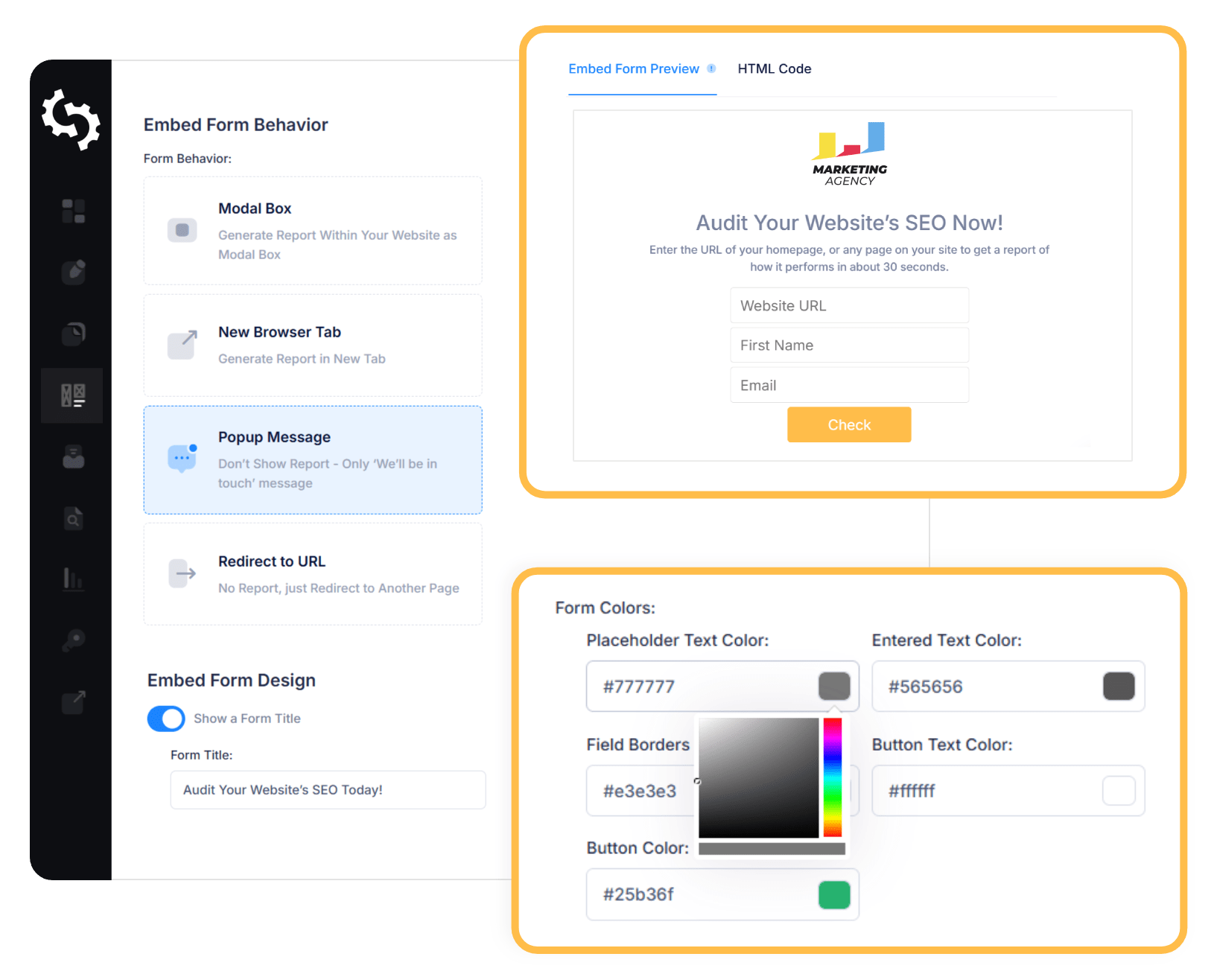 静的な監査ツールや一度限りのSEOチェッカーとは異なり、SEOptimerの埋め込み可能なウィジェットは完全にカスタマイズ可能です。