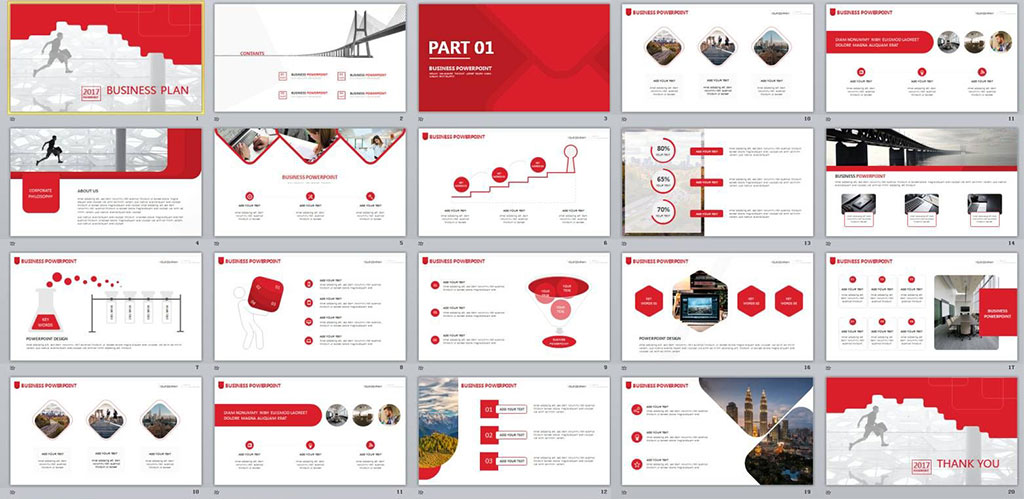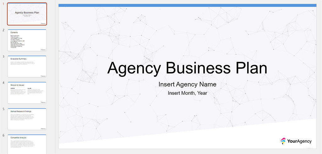 Oprichters van digitale bureaus besteden het grootste deel van hun tijd aan communiceren met personeel, klanten en belanghebbenden in PowerPoint, dus het is logisch om dit formaat te gebruiken voor het communiceren van het algemene bedrijfsplan van het bureau.