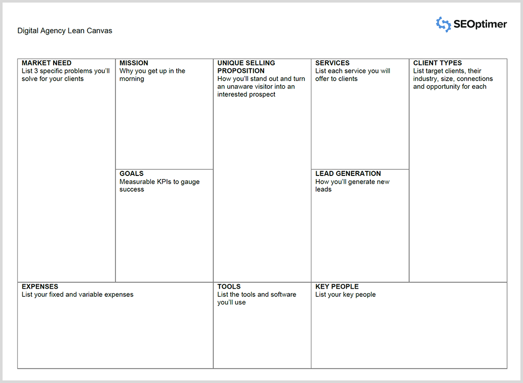 Begin met SEOptimer's Digital Agency Lean Canvas en breng je doelklanten, je focus en hoe je leads zult genereren in kaart.