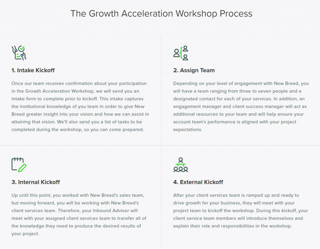 Het onboardingproces zorgt ervoor dat zowel bureau als klant duidelijkheid hebben over zakelijke doelen, rollen en verantwoordelijkheden, doelgroep, communicatieverwachtingen, deliverables, tijdschema's, algemene strategie en rapportage. B2B-bureau, New Breed Marketing heeft hun onboardingproces online gezet: