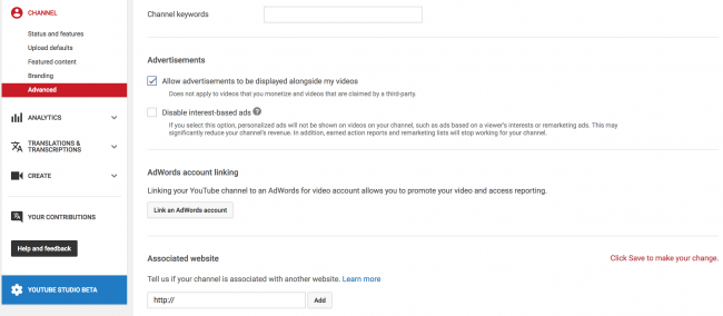 Afhankelijk van de eigenschap, kun je meestal backlinks toevoegen in je profiel of Over sectie (hier te zien bij het aanmaken van je YouTube-kanaal):