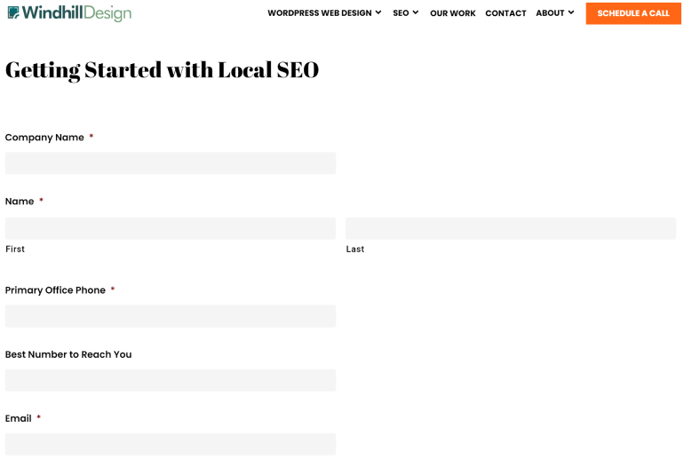 Sommige bureaus zoals Windhill Design (die gespecialiseerd zijn in lokale SEO) publiceren hun klant onboarding vragenlijst op hun website wat een goed idee is voor het werken met externe klanten of kleinere opdrachten.