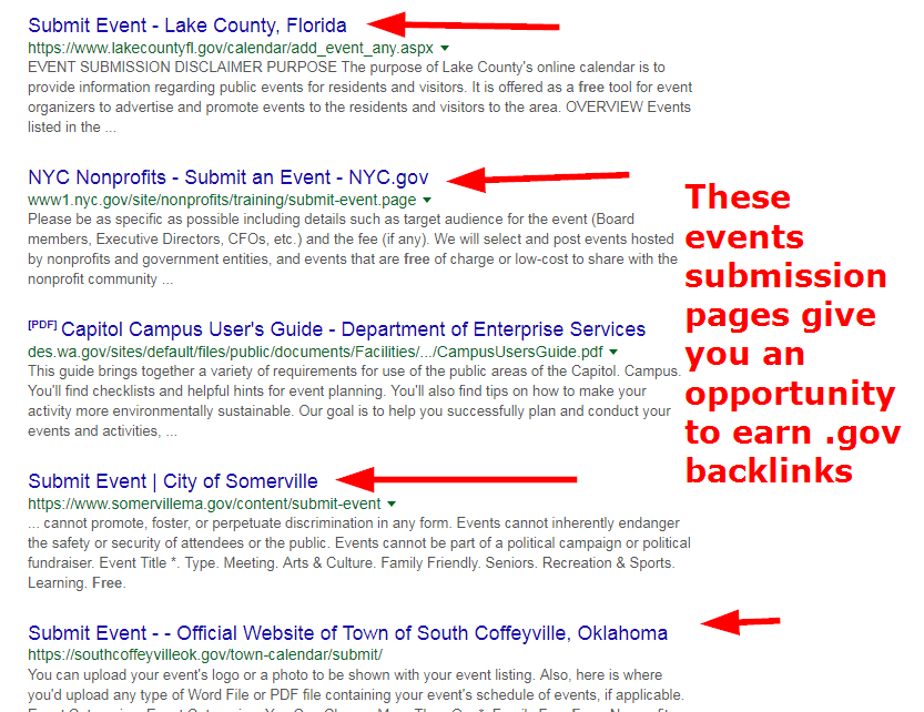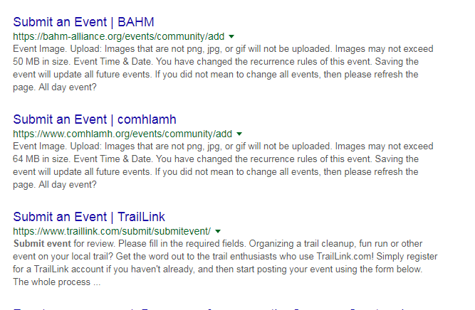 Het ultieme laaghangende fruit voor het verkrijgen van backlinks naar de evenementenpagina van je site zijn gezaghebbende evenementenwebsites. Ik heb er hieronder een paar opgesomd waar je je evenementenpagina kunt indienen: