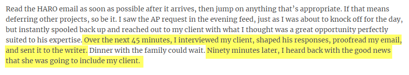 Verzoeken komen met deadlines. Maar hoe sneller je reageert op kansen, hoe groter je kans om in de schijnwerpers te komen door de verzoekende journalist. Behandel reacties in feite alsof ze binnen de volgende twee uur of minder zullen verlopen.