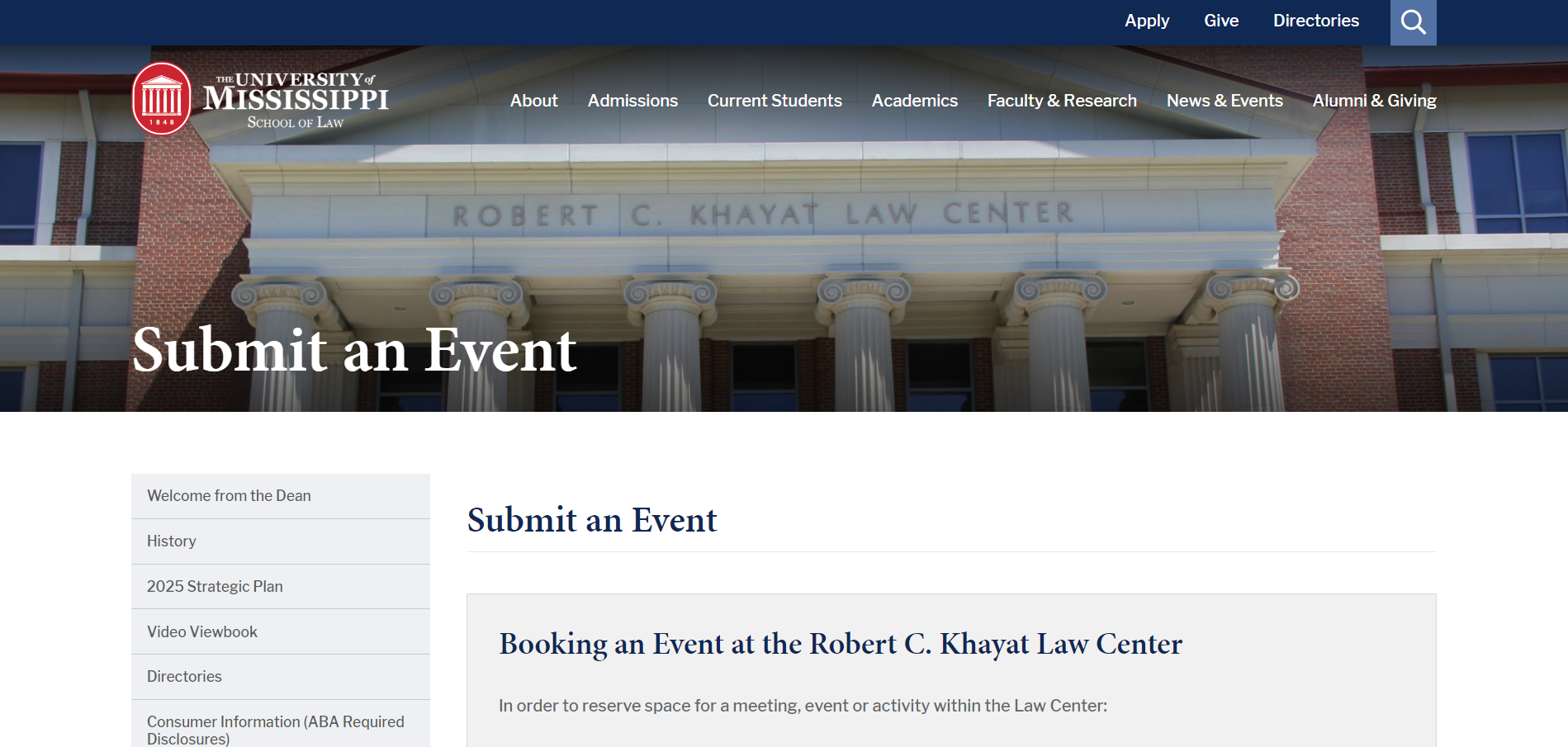 Onder deze leads bevindt zich de University of Mississippi. Hier kun je evenementen organiseren ten behoeve van rechtenstudenten door een formulier in te vullen op de website van de universiteit. Als het wordt goedgekeurd, zal je evenement worden opgenomen in de kalender van de Law School.