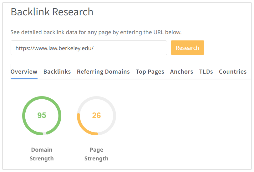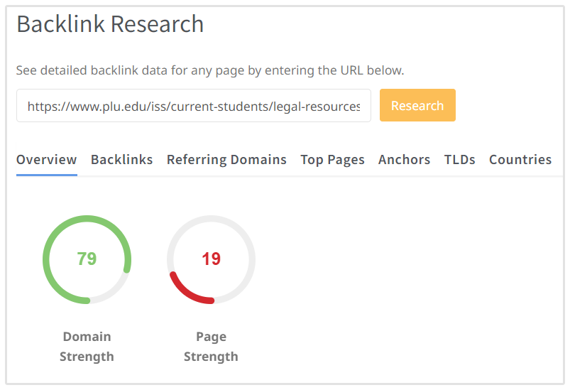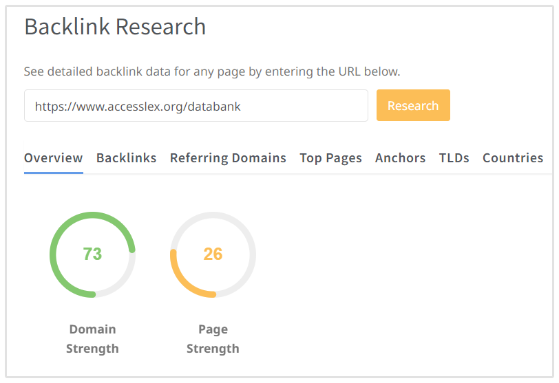 Pagina Sterkte voorspelt hoe goed specifieke pagina's zullen ranken op zoekmachines. Domein Sterkte voorspelt hoe goed een website zal ranken. Beide metrics schalen van één tot 100.