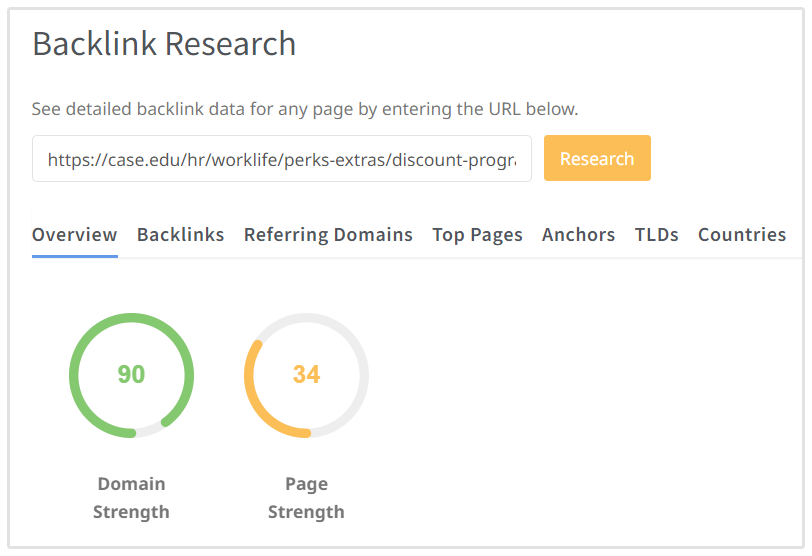 Deze keer heeft de featurepagina een Page Strength-score van 11. En de Domain Strength-score is ook goed, namelijk 64.