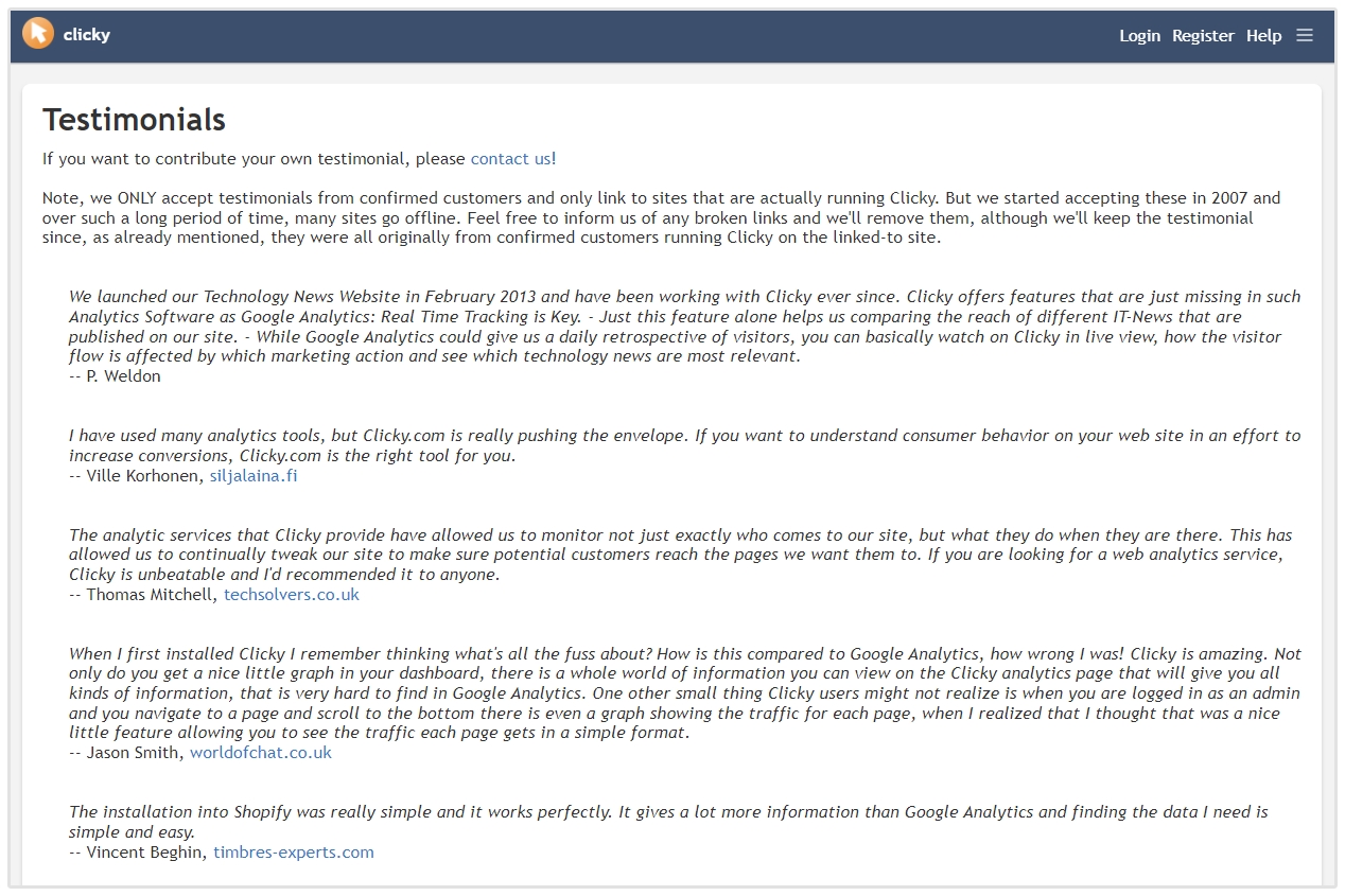 Hier is Clicky's voorbeeld. De site heeft een Domein Sterkte van 87.92 en neemt getuigenissen van hun gebruikers met live links naar de websites van gebruikers.