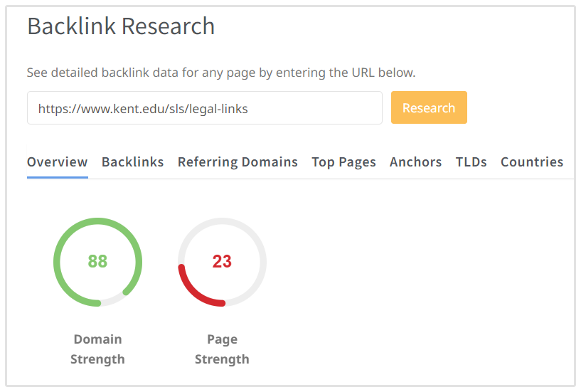 Een nadeel van deze diepe pagina is dat de Page Strength-score eronder lijdt. Maar als je nog steeds de link wilt voor Kent's Domain Strength-score van 88, ga er dan voor!