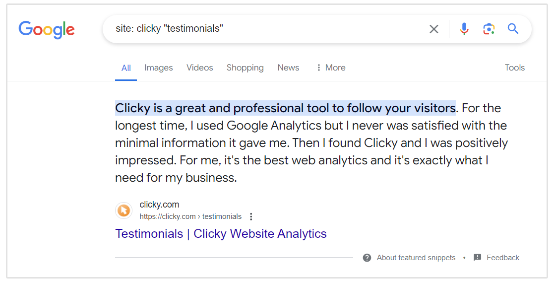 Om erachter te komen of het bedrijf al een testimonials-pagina heeft, kun je deze zoekopdrachten gebruiken: