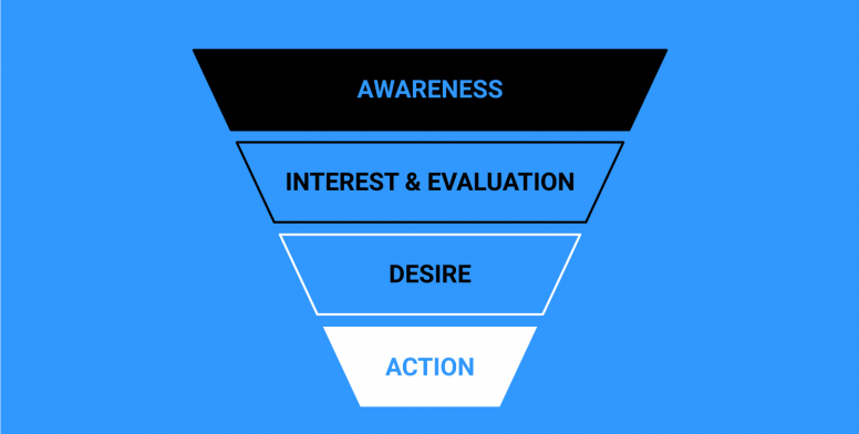 De marketingtrechter is doorgaans verdeeld in vier hoofdfasen - Aandacht, Interesse, Verlangen en Actie. Dit wordt soms het AIDA-model genoemd.