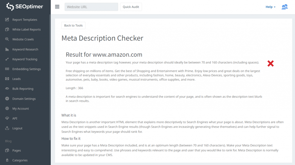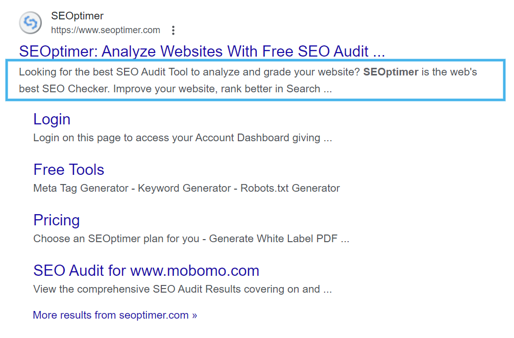 Pro tip: Als je wat inspiratie nodig hebt voor je meta beschrijvingen, kun je de meta beschrijvingen van je concurrenten bekijken met behulp van SEOptimer’s gratis Meta Description Checker tool.