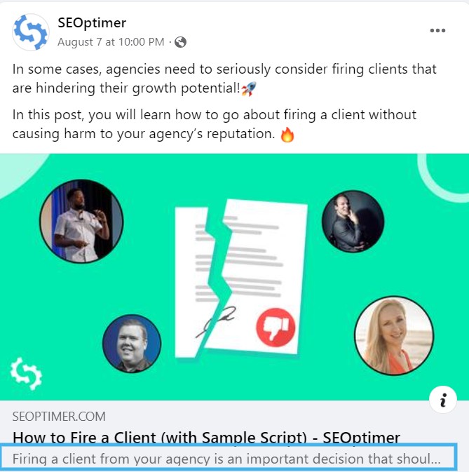 Bijvoorbeeld, hier kun je zien dat Facebook een gedeelte van de meta-omschrijving van de pagina gebruikt in de Facebook-post: