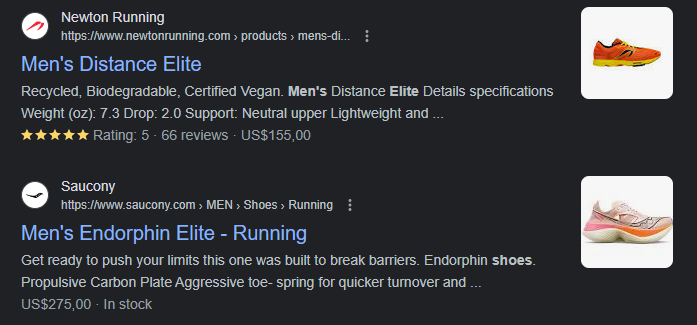 Evenzo kunnen eCommerce-bedrijven productinformatie zoals prijs, fabrikant, productkenmerken, enz. toevoegen aan de metabeschrijving van een productpagina.