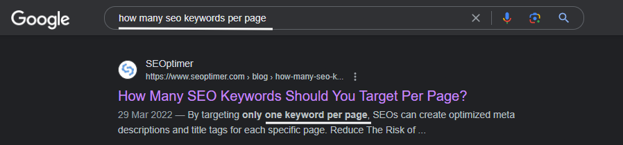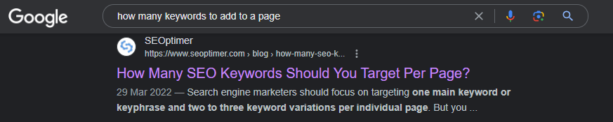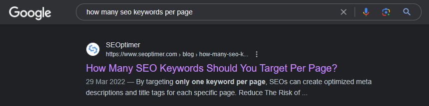 Als je zoekt naar de trefwoorden “hoeveel seo trefwoorden per pagina”, krijg je het volgende zoekresultaat van SEOptimer: