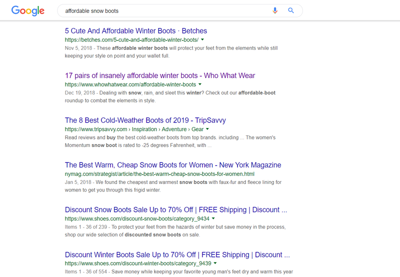 Bekijk de hoogst gerangschikte websites wanneer je zoekt naar je zakelijke niche als een trefwoord. Bijvoorbeeld, als je modebedrijf zich in de niche van sneeuwlaarzen bevindt, zou je de volgende trefwoorden kunnen proberen: