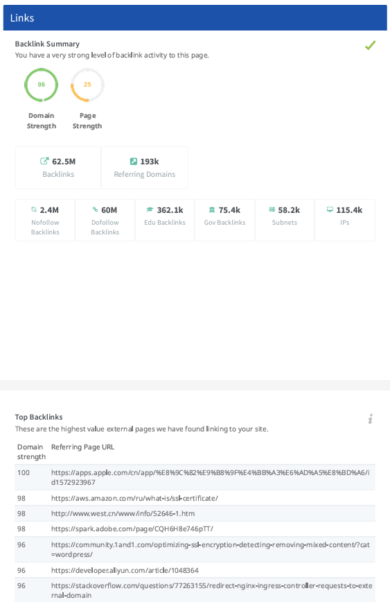 Het moet ook de Top Links, Top Pagina's door Links, Top Anchors door Backlinks, Top Verwijzende Domein Geografieën, On-Page Link Structuur (volg en nofollow externe links) en een controle bevatten die controleert of de URL's van de site vriendelijk zijn voor mensen en zoekmachines.